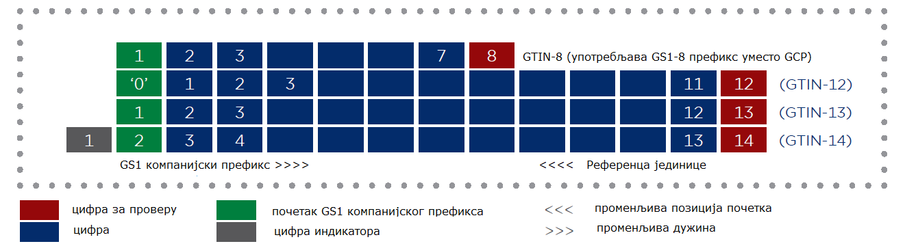 GTIN-ovi mogu biti dugi 8, 12, 13 ili 14 cifara. Njihove strukture podataka zahtevaju polja do 14 cifara, kao i to da svi softveri za obradu GTIN dozvoljavaju njegovu dužinu do 14 cifara.